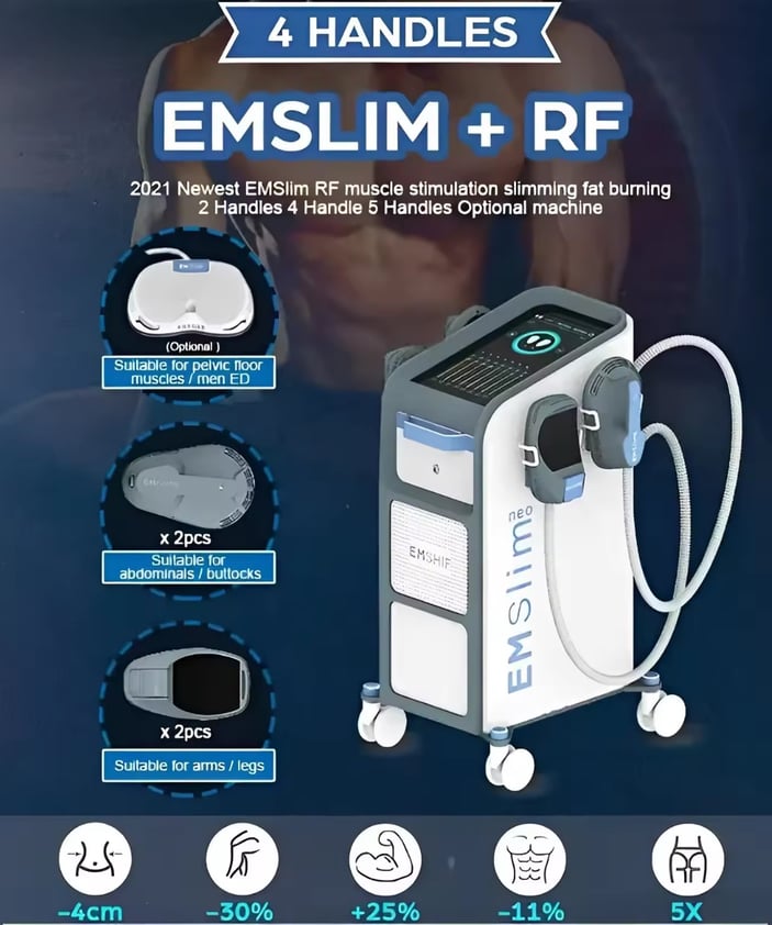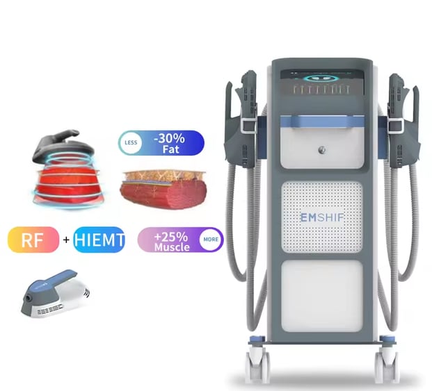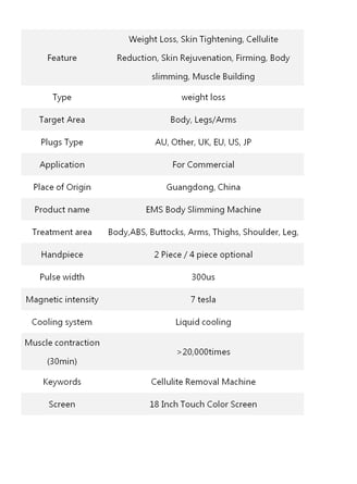 By using HI-EMT( high energy focused electromagnetic wave) technology to expand and contract muscles, limit training, and deep remodeling of muscle internal structure, That is, the growth of myofibrils (muscle enlargement) and the production of new protein chains and muscle fibers (muscle hyperplasia) to train and increase muscle density and volume. HI-EMT 100% limit muscle contraction of the technology can lead to a large amount of fat decomposition, fatty acids from the decomposition of triglyceride outflow, a large amount of accumulation in adipocytes. Fat acidity is too high, fat cells apoptosis, in a few weeks by the body's normal metabolism out of the body.