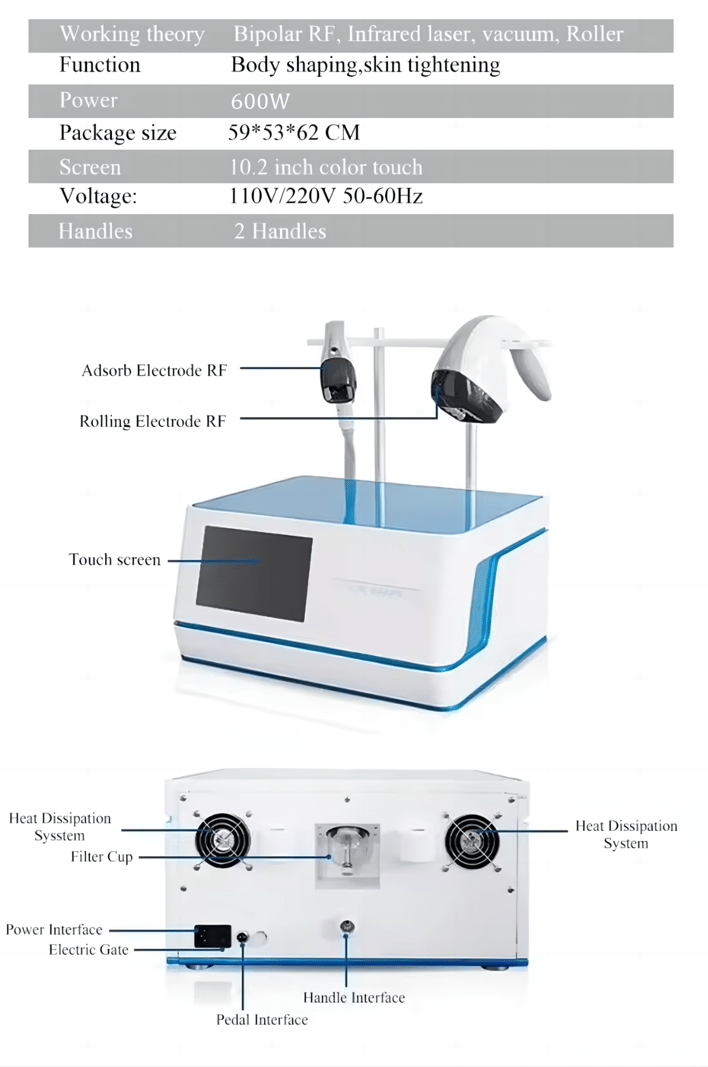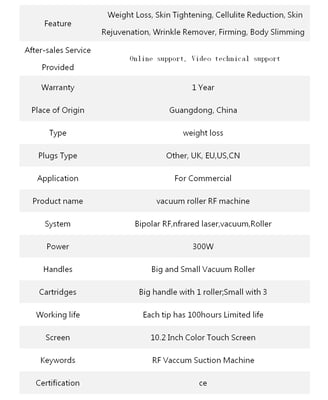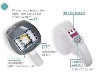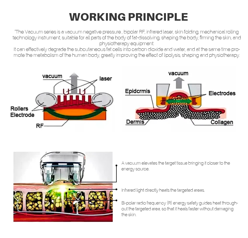 V Shape Vacuum Roller combined with the RF, vacuum, automatic roller, infrared light, . It can penetrate the skin to a depth of 15mm by mechanical movement, which is far more than the depth of the other devices currently on the market. While the heat is conducted, the mechanical movement is carried out simultaneously and so is the fat. In this way, it makes the skin more flexible. It can improve the figure and the skin surface. Although the weight of the patient does not reduce, the patient will look much slimmer because the whole fat area has been re-assigned.