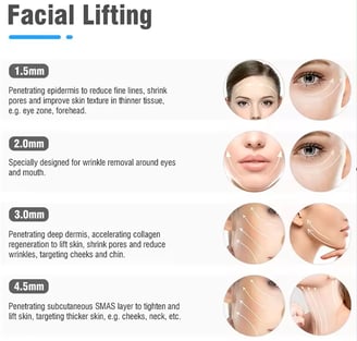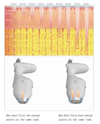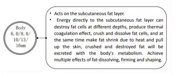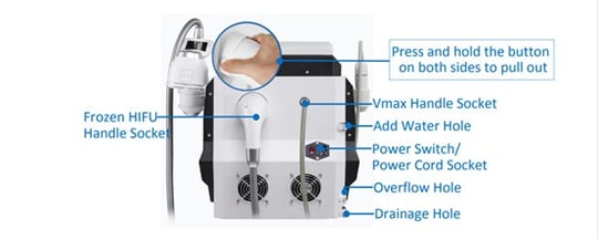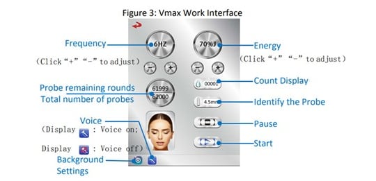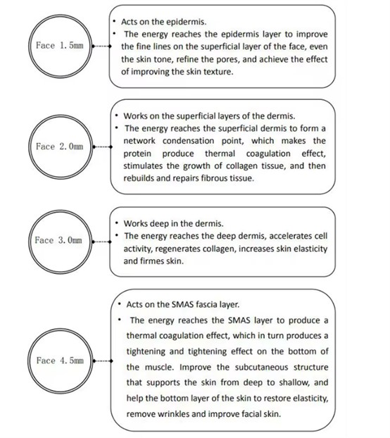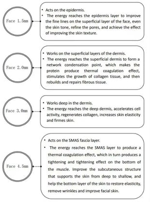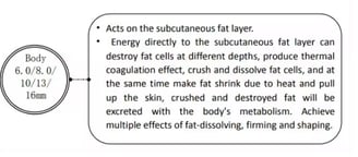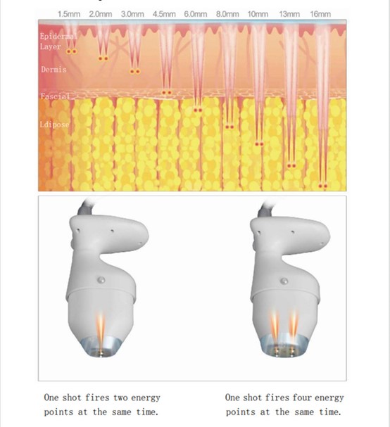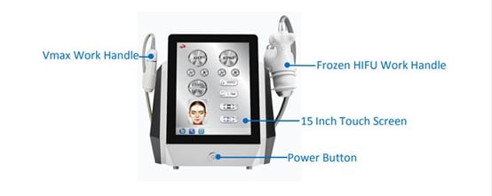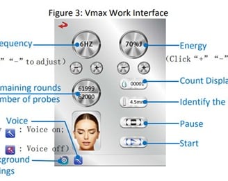Vmax is the use of mechanical radar waves for good tissue penetration, accurately transferring 65 to 72 degrees of thermal energy to the skin's SMAS layer, 1.5 epidermis, 3.0 dermis, 4.5 fascia, 4.5 collagen (other one), 13 fat layer, 8.0 shaping, produce heat coagulation to shrink skin and regenerate collagen. In addition, It can be used to treat obesity and the chest by melting the fat layer (depth 8mm~13mm).