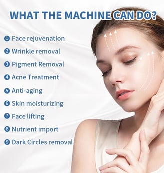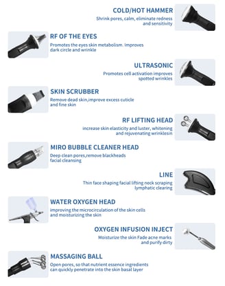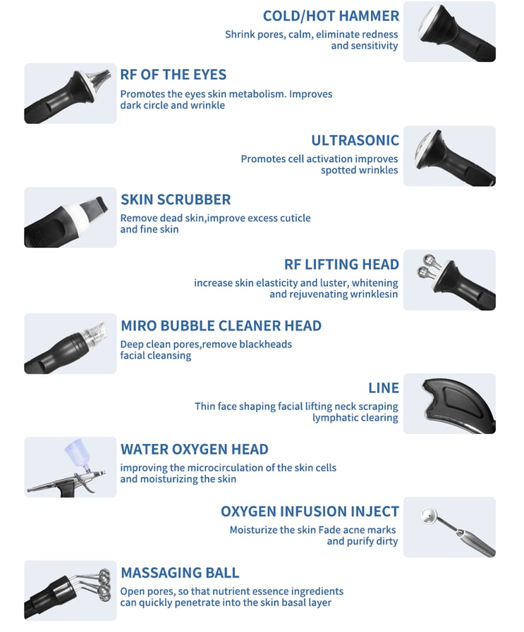 10 in 1: Cold/Hot Hammer ,Rf Of The Eyes,Ultrasonic Head,Skin Scrubber,Rf Lifting Head,Miro Bubble Cleaner Head,Line,Water Oxygen Head, Oxygen Infusion Inject,Massaging Ball