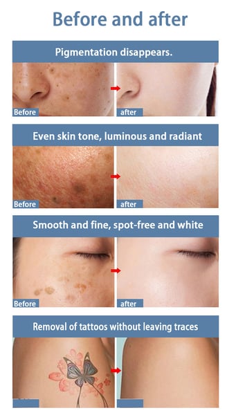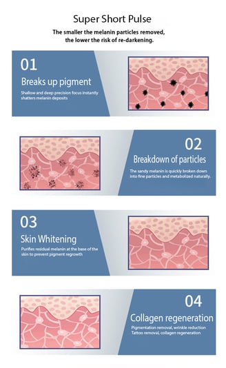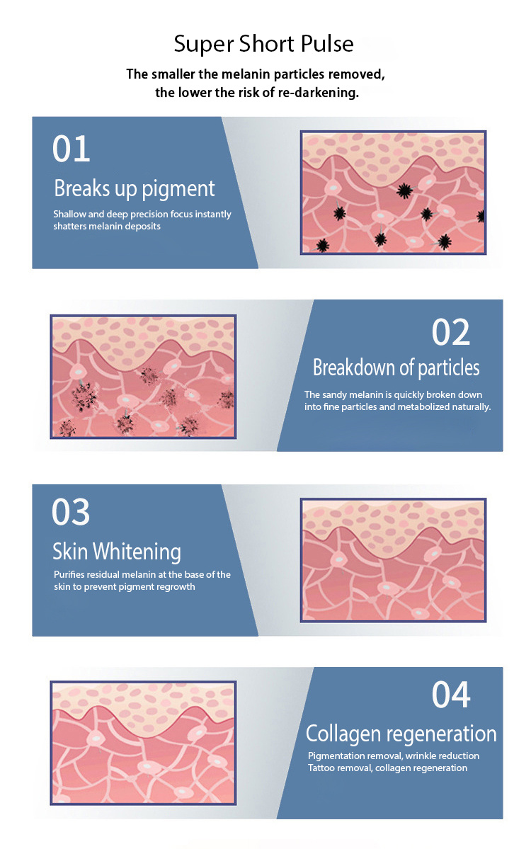 The photo mechanical effect is blasted and torn into pieces, and the selectivity is stronger, which can make pigmented skin lesions produce stronger curative effect under shorter treatment times. In one sentence, "lasers break down pigment particles more thoroughly, while causing less damage to surrounding tissue." If we compare the original pigment particles to rocks, the traditional Q-switched laser can crush these rocks into the size of pebbles, and after using the pico laser, they can be crushed into fine sand, so that the absorption efficiency of pigment fragments is reduced. Greatly improved.