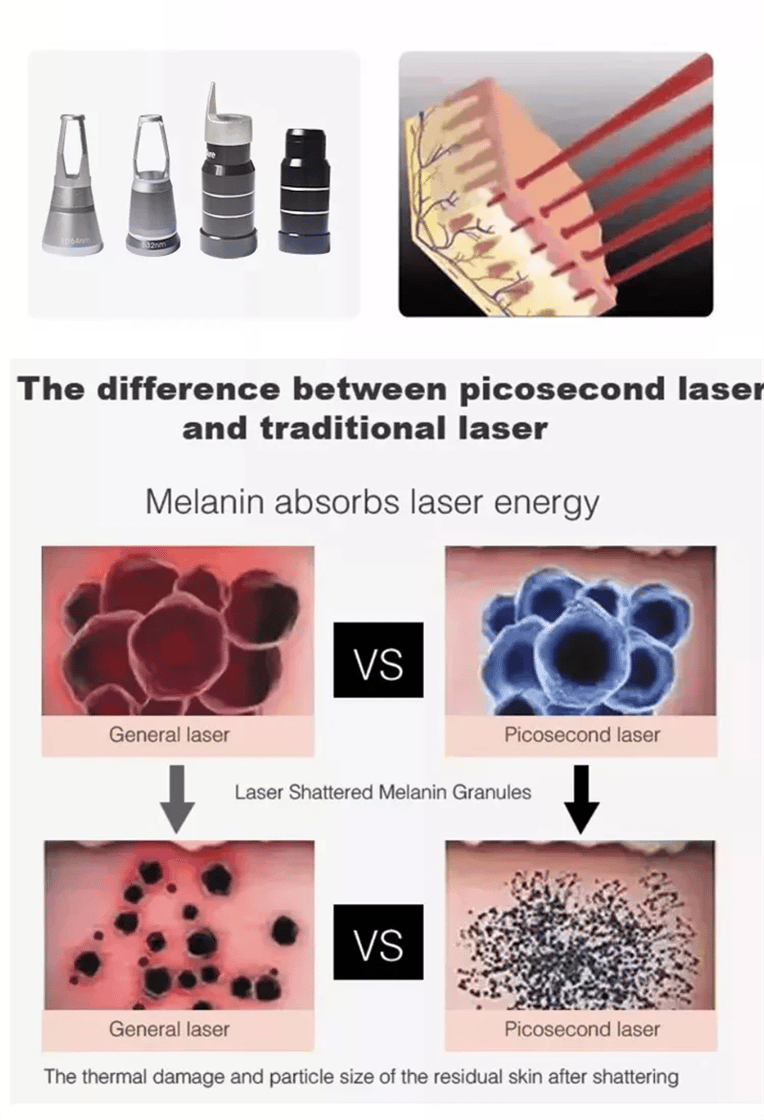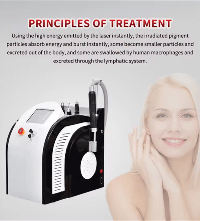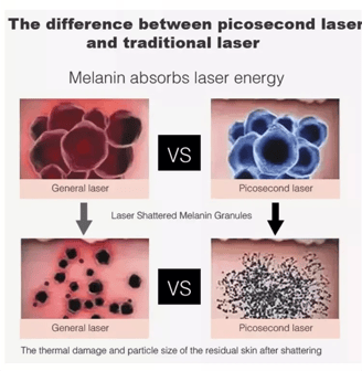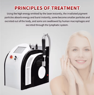 The pico laser nd yag laser uses ultra-short pulses (one trillionth of a second in length) to hit the melanin with a great pressure,the melanin shatters into tiny dust-like particles,Because the particles are so small,they are more readily absorbed and eliminated by the body.It will significantly reduce postoperative swelling,melanin precipitate phenomenon.