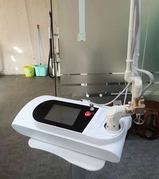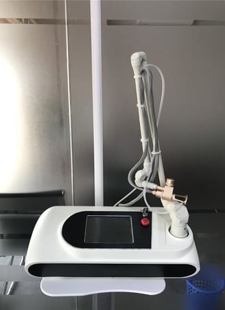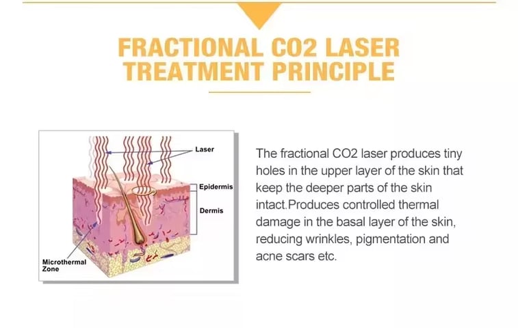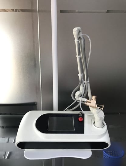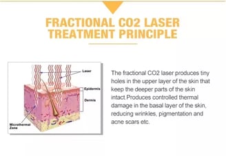 The co2 laser uses a unique head piece which tracks the CO2 10.6 um wavelength light as it passes light through its optical lens to penetrate the skin. We can control the depth of the penetration from only a few micrometers in depth (only as deep as a few sheets of paper) to much deeper with tiny thermal channels. This will also determine the length of healing, the number of treatments and the cost. Each thermal channel creates a small micro-injury but does not significantly disturb or disrupt the surrounding tissue.